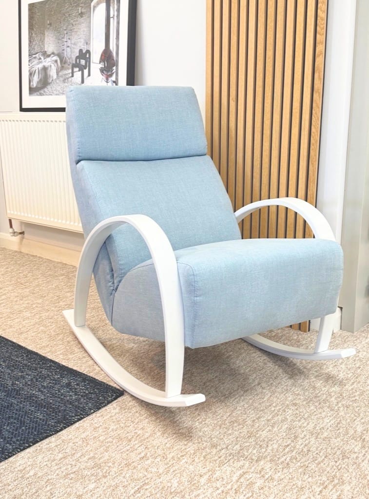 Clearance Reason: This product was previously used in a photoshoot; that can result in minor wear and tear. For example, it may have scuff marks on the legs from being moved around. These signs of use do not necessarily compromise the functionality or overall aesthetic of the product. The modern rocking chair, a fusion of traditional comfort and contemporary design, is an ideal addition to any study or living room. Its compact size ensures it fits seamlessly into smaller spaces, while the ergonomic design with padded seat and back cushions offers unparalleled support. Please ask should you have any questions.